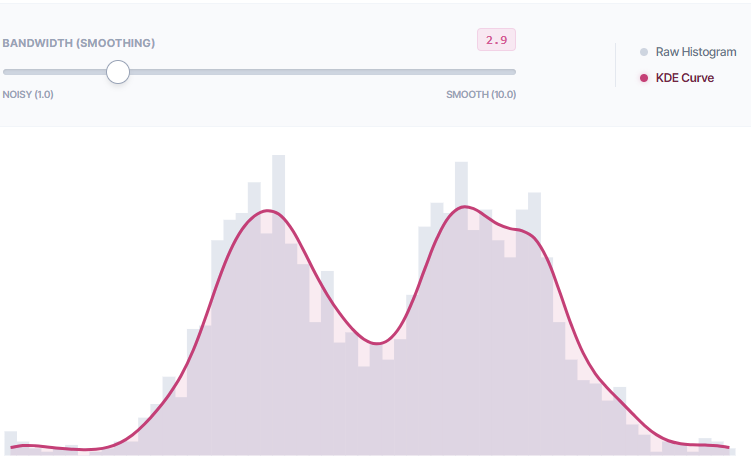 This uses the exact same dataset (2,000 overlapping points). Instead of bins, we overlay a “Kernel Density” curve (Pink). Adjust the Bandwidth to smooth the curve. Notice how much easier it is to see the double peak.